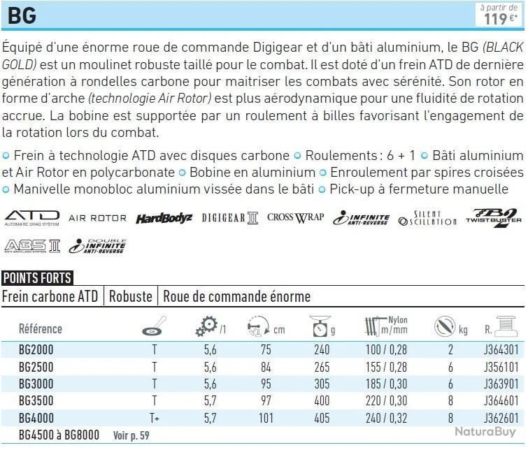 Équipé d’une énorme roue de commande Digigear et d’un bâti aluminium, le BG (BLACK GOLD) est un moulinet robuste taillé pour le combat.