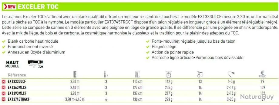 Caractéristiques de la canne Daiwa Exceler Toc 3.60 M 2-16 G:
